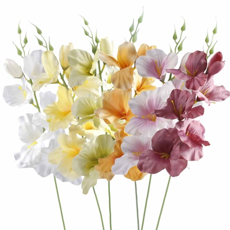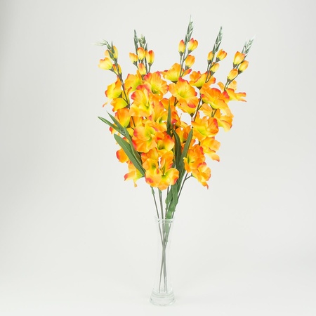 Gladiolus stems have beautiful inflorescence comprising multiple flowers. Their lancet-shaped leaves are reminiscent of a sword, hence their name. Gladioli are sold as part of colour mixes or single-colour sets.